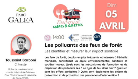 14h00 : Les polluants des forêt : les identifier et mesurer leur impact sanitaire, Toussaint BARBONI, chimiste. 15h00 : Leq polluants éternels : un fléau et environnemental invisible ! Pierre LABADIE, chimiste de l'environnement. Parc Galea - 20230 Taglio Isolaccio.