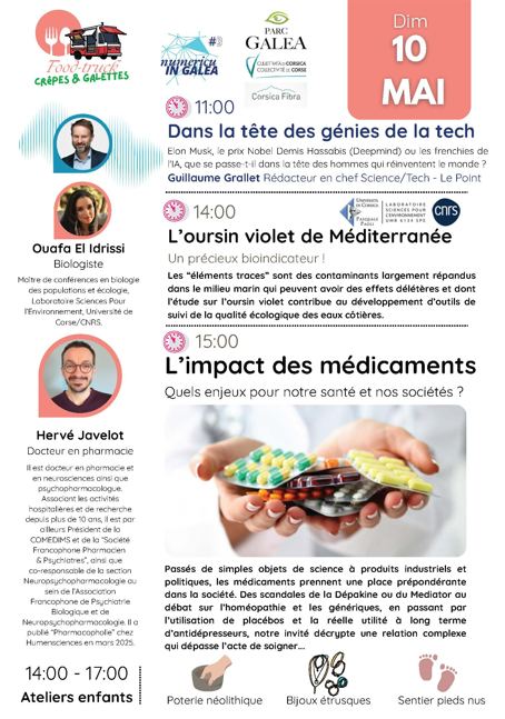Parc Galea - Entretien public avec Ouafa El Idrissi : « L’OURSIN VIOLET DE MEDITERRANEE : un précieux bioindicateur ! » Ouafa El Idrissi, Maître de Conférences en biologie des populations et écologie au sein du laboratoire « Sciences Pour l’Environnement » de l’Université de Corse et du CNRS, participera à un grand entretien public dimanche 10 Mai à partir de 14h00 dans le cadre des rencontres dominicales du Parc Galea. Les “éléments traces” sont des contaminants largement répandus dans le milieu marin qui peuvent avoir des effets délétères et dont l’étude sur l’oursin violet contribue au développement d’outils de suivi de la qualité écologique des eaux côtières. Cet entretien public sera suivi d’une conférence à 15h00 de Hervé Javelot, Docteur en pharmacie, intitulée « L'impact des médicaments : quels enjeux pour notre santé et nos sociétés ? ». Cette action s’inscrit dans le PIA UNIversité : pour la Transformation au service des territoires Insulaires méditerranéens, porté par l’Université de Corse. Rendez-vous : Dimanche 10 mai 2026 de 14h00 à 15h00, Parc Galea, Taglio Isolaccio. Proposé par : Laboratoire Sciences Pour l'Environnement (CNRS / Université de Corse), Mission science avec et pour la société. En partenariat avec : Parc Galea.