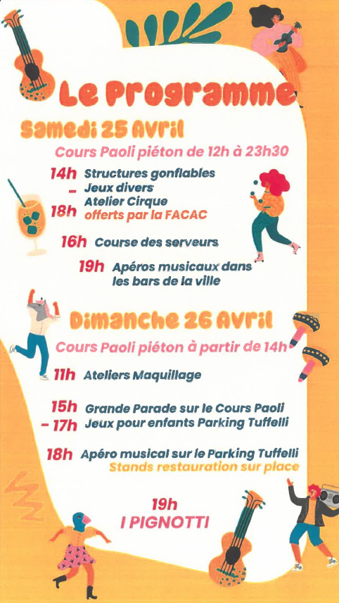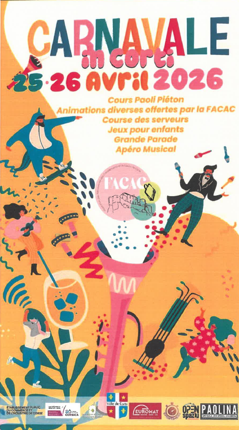 U Carnavale in Corti kehrt für seine neue Ausgabe am 25. und 26. April zurück. Seien Sie dabei und feiern Sie mit mit schillernden Kostümen, farbenfrohen Umzügen, festlicher Stimmung, Live-Musik, riesigen Marionetten und wunderschön geschmückten Wagen! Programm : Samstag, 26. April: cours paoli pièton . Sonntag, 27. April: cours paoli pièton . Große Parade auf dem Cours Paoli.