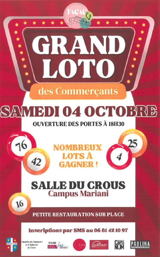 Lotto der Händler, 3. Ausgabe des großen Lottos der Händler, Samstag, 4. Oktober 2025 um 20 Uhr. Saal des CROUSS, Campus Mariani, Öffnungszeiten von 18.30 Uhr bis 18.30 Uhr, kleine Snacks vor Ort. Zahlreiche Preise zu gewinnen: Hotelübernachtungen, Haushaltsgeräte, Werkzeuge, Einkaufsgutscheine. Reservierungen per SMS unter 06 81 42 10 97.