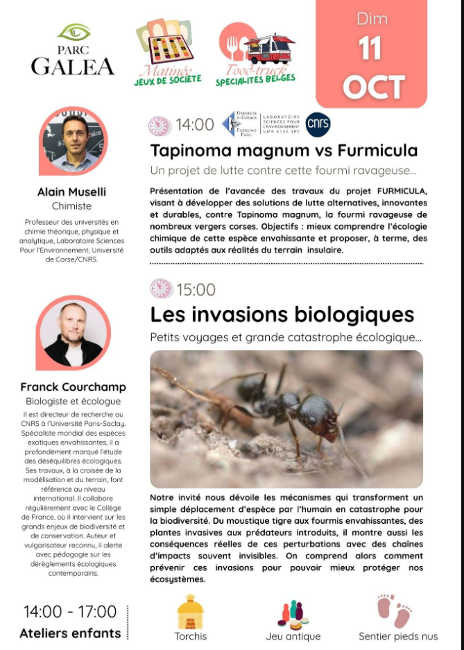 Parc Galea - Öffentliches Gespräch mit Alain Muselli: "TAPINOMA MAGNUM VS FURMICULA: Ein Projekt zur Bekämpfung dieser schädlichen Ameise". Alain Muselli, Universitätsprofessor für theoretische, physikalische und analytische Chemie im Labor "Sciences Pour l'Environnement" der Universität Korsika und des CNRS, wird am Sonntag, den 11. Oktober ab 14.00 Uhr im Rahmen der sonntäglichen Treffen im Parc Galea an einem großen öffentlichen Gespräch teilnehmen. In dieser Rede werden wir die Fortschritte der Arbeiten vorstellen, die im Rahmen des Projekts FURMICULA durchgeführt wurden, das gemeinsam vom Laboratoire Sciences de l'Environnement der Universität Korsika und dem Office de Développement Agricole et Rural de la Corse getragen wird. Ziel dieses Projekts ist die Entwicklung alternativer, innovativer und umweltfreundlicher Bekämpfungslösungen gegen T. magnum, die Ameise, die zahlreiche Obstplantagen auf Korsika schädigt. Unser Ansatz beruht auf einer Strategie, die (i) die Identifizierung und Verwendung von Pheromonen zur Störung oder Ablenkung des Verhaltens des Insekts und (ii) die Entwicklung von Formulierungen auf der Basis von natürlichen Produkten mit insektiziden Eigenschaften umfasst. Das Ziel ist ein doppeltes: ein besseres Verständnis der chemischen Ökologie dieser invasiven Art und schließlich die Bereitstellung operationeller Instrumente für ein nachhaltiges Management, das an die Realitäten der Landwirtschaft auf der Insel angepasst ist. Im Anschluss an das öffentliche Gespräch findet um 15:00 Uhr ein Vortrag des Biologen und Ökologen Franck Courchamp zum Thema "Biologische Invasionen: Kleine Verschiebungen und ökologische Katastrophen" statt. Diese Maßnahme ist Teil des von der Universität Korsika getragenen PIA UNIversité: pour la Transformation au service des territoires Insulaires méditerranéens. Termin: Sonntag, den 11. Oktober 2026 von 14.00 bis 15.00 Uhr. Vorgeschlagen von: Laboratoire Sciences Pour l'Environnement (CNRS / Université de Corse), Mission science avec et pour la société (Mission Wissenschaft mit und für die Gesellschaft). In Partnerschaft mit : Parc Galea.