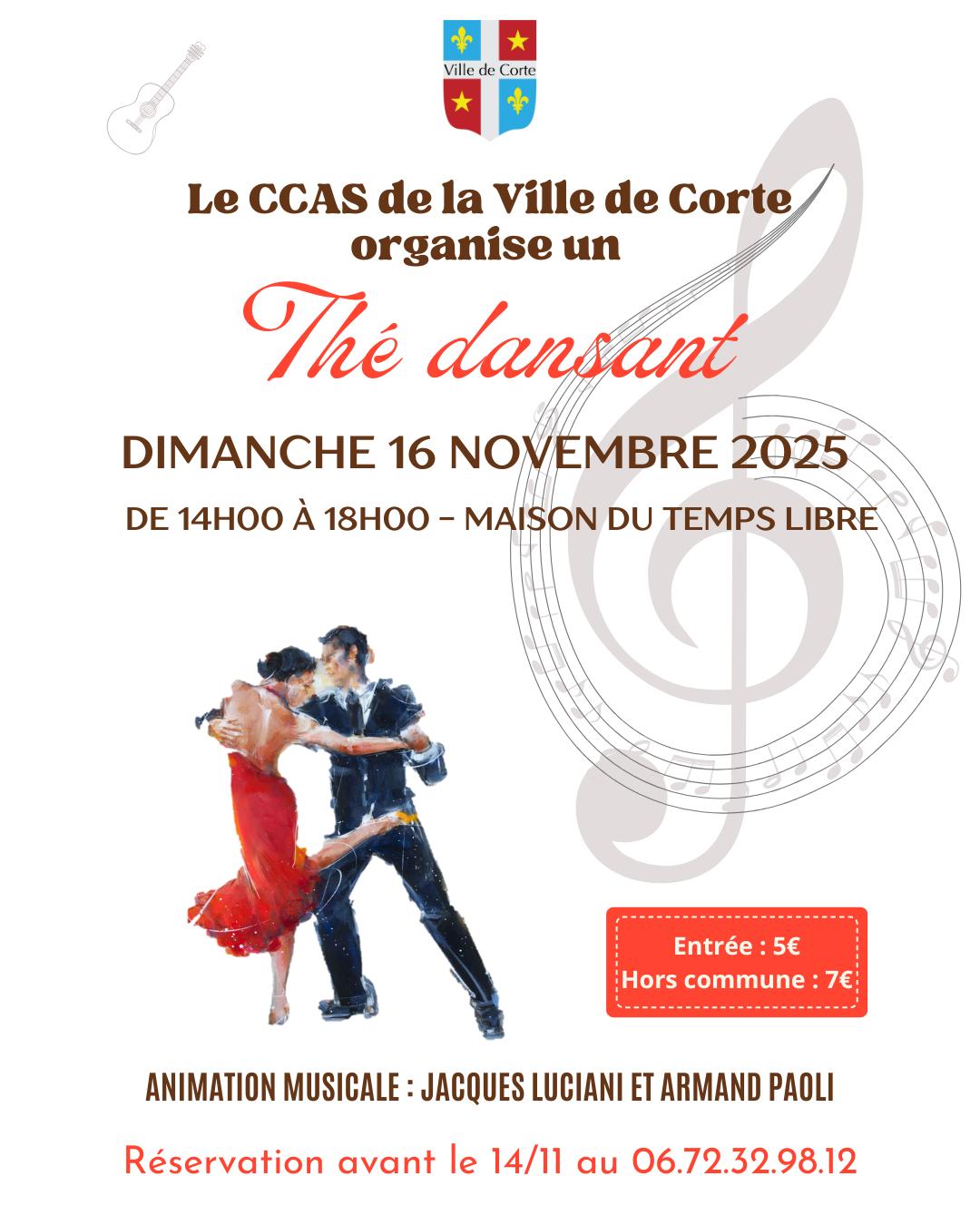 Das CCAS der Stadt Corte lädt Sie zu einem Tanztee am Sonntag, den 16. November 2025, von 14.00 bis 18.00 Uhr im Maison du Temps Libre ein. Musikalische Anmationen: Jacques Luciani und Armand Paoli. Reservierung vor dem 14.11. unter 06 72 32 98 12. Eintritt 5 €, außerhalb der Gemeinde 7 €.