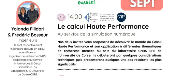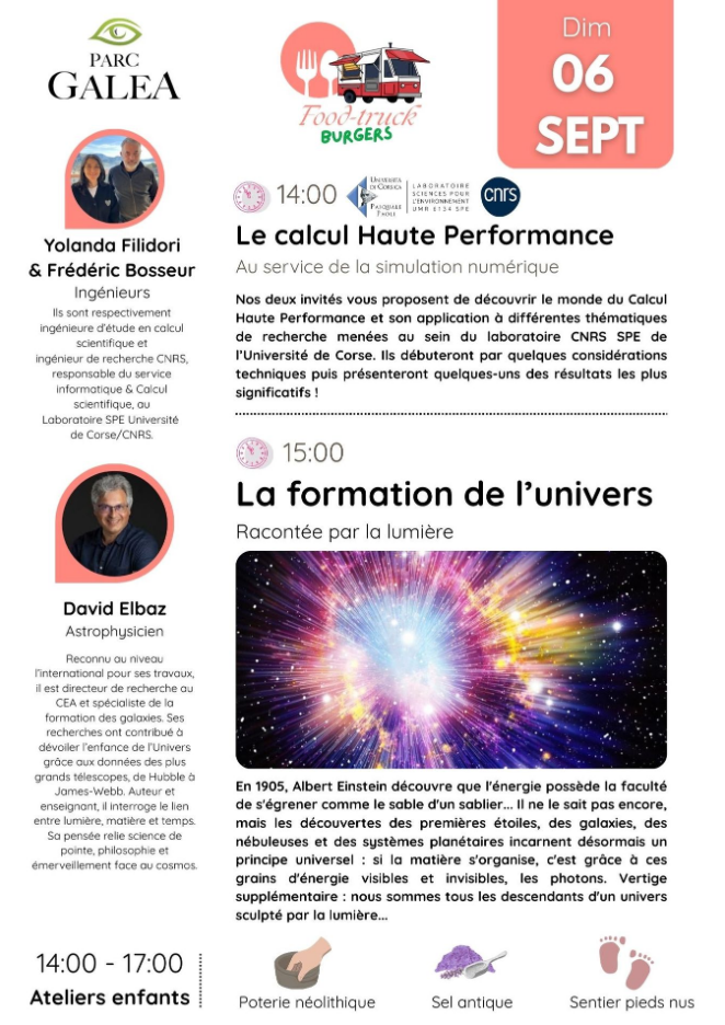 Parc Galea - Public interview with Yolanda Filidori and Frédéric Bosseur: "HIGH-PERFORMANCE COMPUTING: at the service of digital simulation". Yolanda Filidori, a research engineer in scientific computing, and Frédéric Bosseur, a CNRS research engineer in the "Sciences Pour l'Environnement" laboratory at the University of Corsica and the CNRS, will be taking part in a wide-ranging public discussion on Sunday 6 September from 2.00 pm as part of the Sunday meetings at Parc Galea. In this talk, we invite you to discover the world of High-Performance Computing and its application to various research themes conducted within the CNRS SPE laboratory at the University of Corsica. We will begin with a few technical considerations and then present some of the most significant results. This public talk will be followed by a lecture at 3pm by Davis Elbaz, astrophysicist, entitled "La formation de l'univers racontée par le lumière". This initiative is part of the PIA UNIversité: pour la Transformation au service des territoires Insulaires méditerranéens, supported by the University of Corsica. Meeting point : Sunday 06 September 2026 from 14:00 to 15:00. Parc Galea, Taglio Isolaccio. Proposed by : Laboratoire Sciences Pour l'Environnement (CNRS / Université de Corse), Mission science avec et pour la société. In partnership with : Parc Galea.