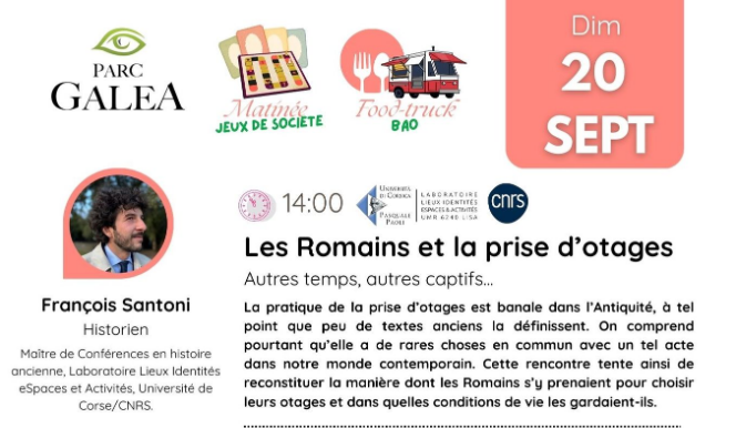 Parc Galea - Public talk with François Santoni: "THE ROMANS AND THE TAKING OF HOSTAGES: other times, other captives...". François Santoni, Senior Lecturer in Ancient History at the "Places, Identities, Spaces and Activities" laboratory of the University of Corsica and the CNRS, will be taking part in a major public talk on Sunday 20 September from 2pm as part of the Sunday meetings at the Parc Galea. The practice of taking hostages was commonplace in Antiquity, so much so that few ancient texts define it. Yet it is easy to see that it has little in common with such an act in our contemporary world. This meeting will attempt to reconstruct how the Romans went about choosing their hostages and the conditions under which they kept them. This public talk will be followed by a lecture at 3pm by Franck Monnier, Egyptologist, entitled "Mysteries of Ancient Egypt: scientific proof". This initiative is part of the PIA UNIversité: pour la Transformation au service des territoires Insulaires méditerranéens, supported by the University of Corsica. Meeting point : Sunday 20 September 2026 from 14:00 to 15:00, Parc Galea, Taglio Isolaccio. Proposed by : Places, Identities, eSpaces and Activities Laboratory (CNRS / University of Corsica), Mission science avec et pour la société. In partnership with : Parc Galea.
