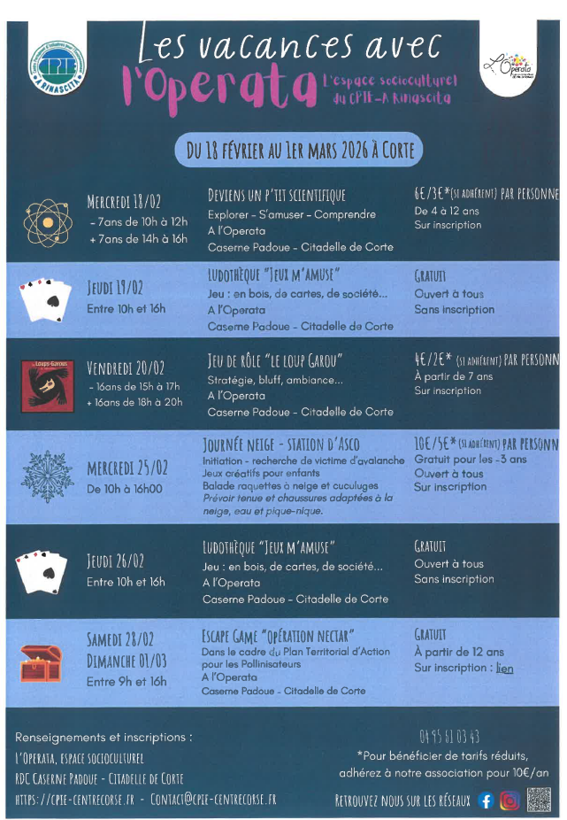 The school holidays are approaching and our team has put together a varied programme of activities to keep young and old alike entertained. From 18 February to 1 March, there's something for everyone, from scientific games and role-playing to snow days, escape games and toy library days. Some activities require registration and participation at the Operata reception desk (Caserne Padoue, opposite the Musée de la Corse). For more information: 04 95 61 03 43 or contact@cpie-centrecorse.fr