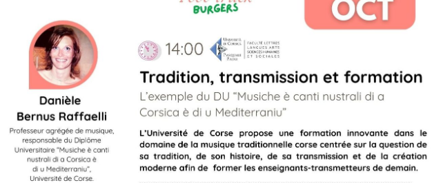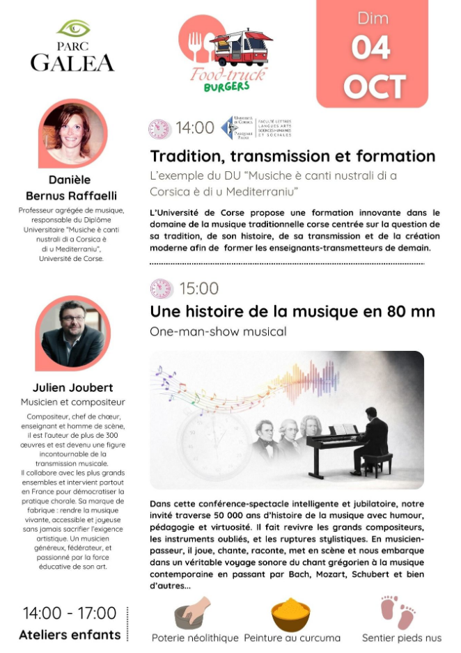 Parc Galea - Public interview with Danièle Bernus Raffaelli, "TRADITION, TRANSMISSION ET FORMATION: L'exemple du Diplôme Universitaire "Musiche è canti nustrali di a Corsica è di u Mediterraniu"". Danièle Bernus Raffaelli, Associate Professor of Music and head of the "Musiche è canti nustrali di a Corsica è di u Mediterraniu" University Diploma at the University of Corsica, will be taking part in a wide-ranging public discussion on Sunday 4 October from 2.00 pm as part of the Sunday meetings at Parc Galea. In partnership with the Institut d'études supérieures de musique Europe Méditerranée in Aix-en-Provence, the Università di Corsica Pasquale Paoli is offering an innovative double degree course in traditional Corsican music. It focuses on tradition, its history, how it is passed on and the creative work that modernises it, in order to train the teachers and transmitters of tomorrow. This public talk will be followed by a lecture at 3pm by Julien Joubert, musician and composer, entitled "All the history of music in an 80-minute piano show". This initiative is part of the PIA UNIversité: pour la Transformation au service des territoires Insulaires méditerranéens, supported by the University of Corsica. Meeting point : Sunday 04 October 2026 from 14:00 to 15:00, Parc Galea, Taglio Isolaccio. Proposed by : Mission science avec et pour la société. In partnership with : Parc Galea.