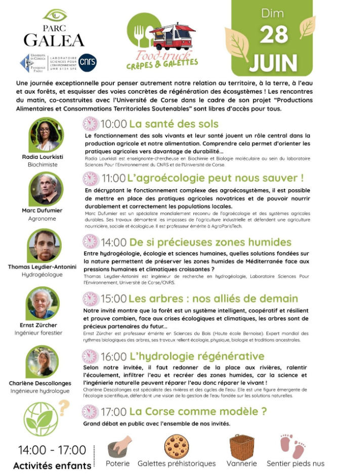 Parc Galea - A day dedicated to the regeneration of ecosystems: "THE HEALTH OF SOILS". Radia Lourkisti, Senior Lecturer in Biochemistry and Molecular Biology in the "Sciences Pour l'Environnement" laboratory at the University of Corsica and the CNRS, will be taking part in this special day on Sunday 28 June at 10.00am. The functioning of living soils and their health play a central role in agricultural production and our food supply. Understanding this enables us to steer farming practices towards greater sustainability... "THE PRECIOUS WETLANDS". Thomas Leydier-Antonini, a research engineer in hydrogeology at the "Sciences Pour l'Environnement" laboratory at the University of Corsica and the CNRS, will be taking part in this special day on Sunday 28 June at 10.00am. Coastal wetlands play a key role in biodiversity, the preservation of drinking water resources and protection against coastal erosion. Through a study combining hydrogeology, ecology and human sciences, this conference explores the functioning of these ecosystems and the potential of Nature-based Solutions for their preservation in the face of growing human and climatic pressures in the Mediterranean. The day will also feature the following presentations: 11.00am: "Agroecology can save us" by Marc Dufumier, Agronomist; 15:00: "Trees: our allies of tomorrow" by Ernest Zürcher, Forestry Engineer; 16:00: "Regenerative hydrology" by Charlène Descollonges, Hydrologist. Conditions and prices for access to the Parc Galea are given in the downloadable agenda or on the Parc Galea website. This action is part of the PIA UNIversité: pour la Transformation au service des territoires Insulaires méditerranéens, supported by the University of Corsica. Rendez-vous : Sunday 28 June 2026 from 10.00 am to 5.30 pm. Proposed by : Laboratoire Sciences Pour l'Environnement (CNRS / Université de Corse), Mission science avec et pour la société. In partnership with : Parc Galea.
