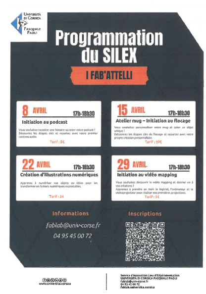 I Fab'Attelli - ore 17-18.30 - 8 aprile: Introduzione al podcasting, 5 euro. - 15 aprile: Laboratorio sulle tazze, introduzione alla floccatura. - 22 aprile: Creazione di illustrazioni digitali. - 29 aprile: Introduzione al video mapping. Info e iscrizioni: fablab@univ-corse.fr, Caserma Padoue, Haute Ville, Corti.