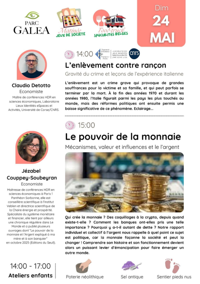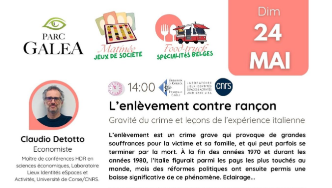 Parc Galea - Intervista pubblica a Claudio Detotto. "Rapimento vs. stupro: la gravità del reato e gli insegnamenti dell'esperienza italiana". Claudio Detotto, docente senior di economia presso il laboratorio "Luoghi, identità, spazi e attività" dell'Università della Corsica e del CNRS, parteciperà a un'importante conferenza pubblica domenica 24 maggio dalle 14.00 nell'ambito degli incontri domenicali al Parc Galea. L'intervento sarà incentrato sull'analisi del fenomeno criminale del rapimento a scopo di riscatto. Il rapimento è un reato grave che causa grandi sofferenze alla vittima e alla sua famiglia e che talvolta può concludersi con la morte. Alla fine degli anni '70 e durante gli anni '80, l'Italia è stata uno dei Paesi più colpiti al mondo, ma le riforme politiche hanno poi portato a una significativa riduzione del fenomeno. Questa conferenza pubblica sarà seguita alle 15.00 da una conferenza di Jézabel Couppet-Soubeyran, economista, dal titolo "Mécanisme et pouvoirs de la monnaie". Questa azione fa parte del progetto PIA UNIversité: pour la Transformation au service des territoires Insulaires méditerranéens, sostenuto dall'Università della Corsica. Punto d'incontro : Domenica 24 maggio 2026 dalle 14:00 alle 15:00. Parco Galea, Taglio Isolaccio. Proposto da : Laboratorio Luoghi, Identità, Spazi e Attività (CNRS/Università della Corsica). Missione scienza con e per la società. In collaborazione con : Parc Galea.