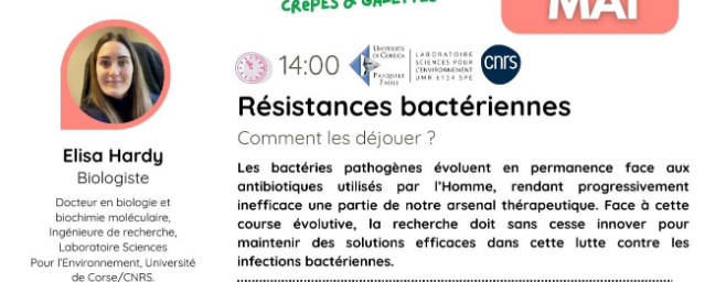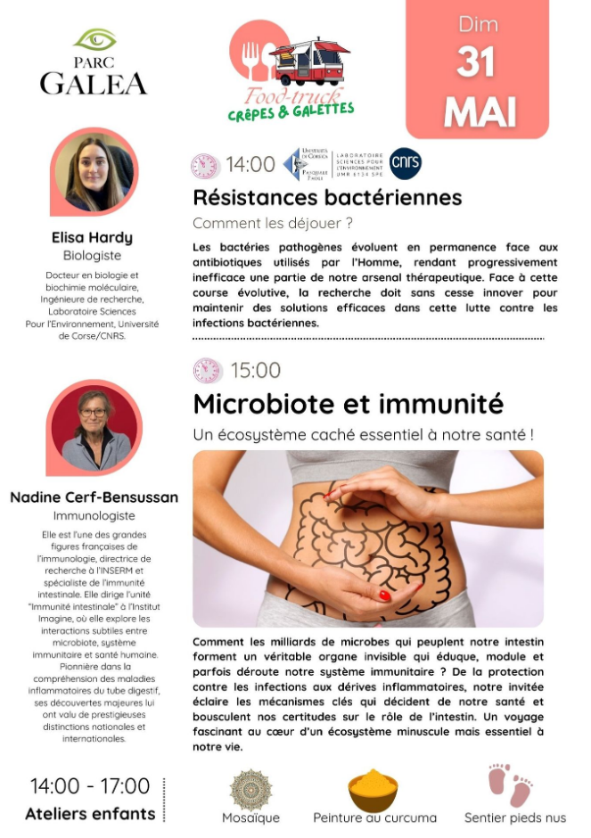 Parc Galea - Conferenza pubblica con Elisa Hardy "RESISTENZA BATTERICA: come giocarla". Elisa Hardy, ingegnere ricercatore e dottore in biologia e biochimica molecolare presso il laboratorio "Sciences Pour l'Environnement" dell'Università della Corsica e del CNRS, parteciperà a un'importante conferenza pubblica domenica 31 maggio dalle 14:00 nell'ambito degli incontri domenicali al Parc Galea. I batteri patogeni sono in costante evoluzione di fronte agli antibiotici utilizzati dall'uomo. Hanno meccanismi di difesa intrinseci e sono anche in grado di acquisire o sviluppare nuove resistenze, rendendo gradualmente inefficace parte del nostro arsenale terapeutico. Di fronte a questa corsa evolutiva, la ricerca deve innovare costantemente per mantenere soluzioni efficaci nella lotta contro le infezioni batteriche. Questa conferenza pubblica sarà seguita, alle 15.00, da un intervento di Nadine Cerf-Bensussan, immunologa, dal titolo "Microbiota e immunità: un ecosistema nascosto essenziale per la nostra salute". Questa iniziativa fa parte del progetto PIA UNIversité: pour la Transformation au service des territoires Insulaires méditerranéens, sostenuto dall'Università della Corsica. Appuntamento: Domenica 31 maggio 2026 dalle 14.00 alle 15.00. Parco Galea, Taglio Isolaccio. Proposto da : Laboratoire Sciences Pour l'Environnement (CNRS / Université de Corse), Mission science avec et pour la société. In collaborazione con : Parc Galea.