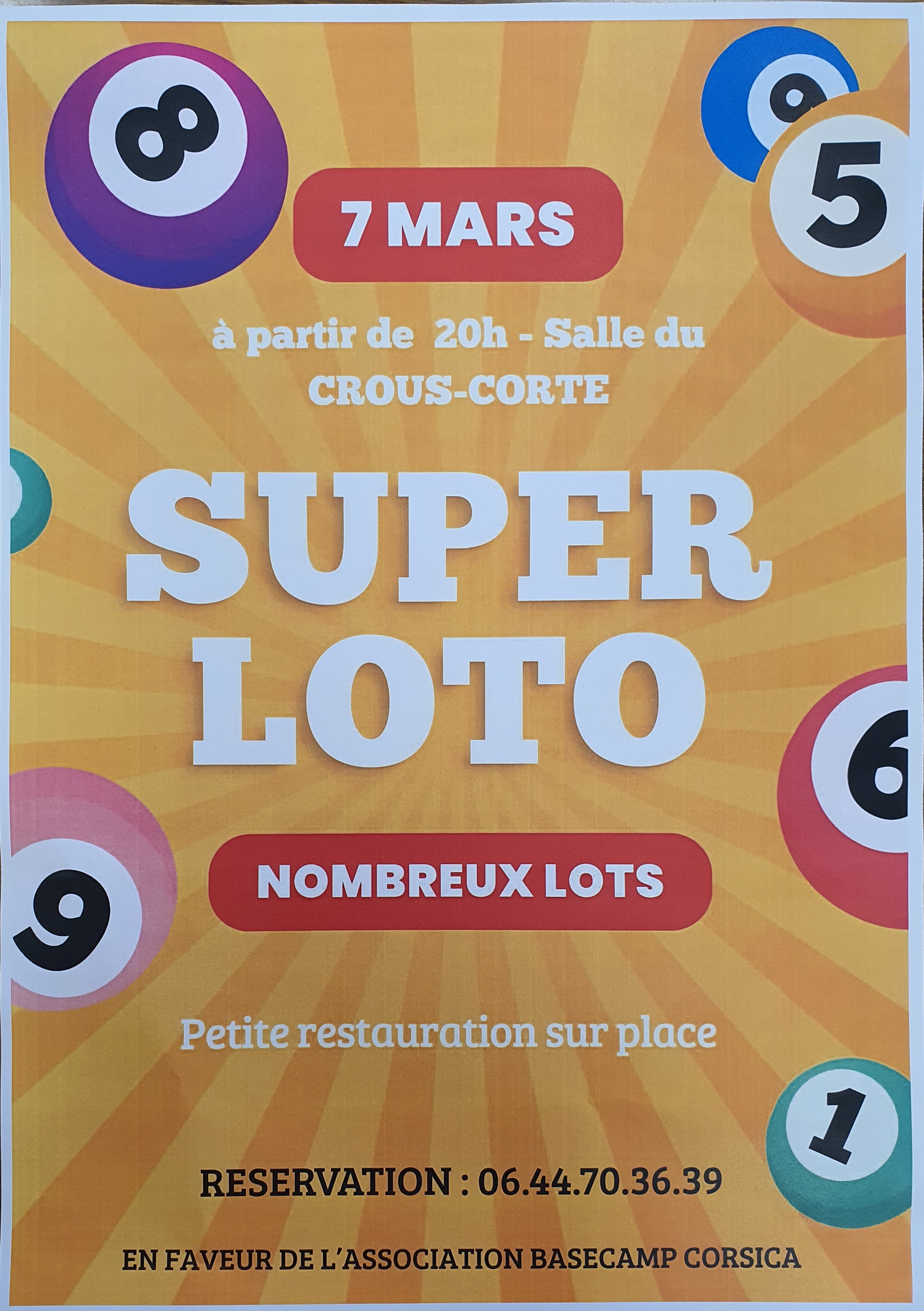 Unitevi a noi per una serata di suspense e buon umore a Corte! Super Loto - 7 marzo dalle 20:00. ? Salle du CROUS - Corte. Venite a tentare la fortuna e tornate a casa con tanti premi in palio. Spuntini e merende in loco per godersi la serata in un'atmosfera amichevole. Prenotazioni: 06 44 70 36 39. ? Evento a favore dell'associazione Basecamp Corsica. Una grande opportunità per divertirsi, vincere e sostenere un'associazione locale!