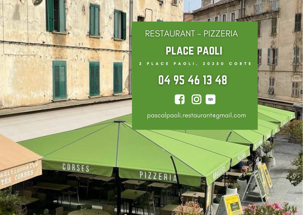 Restaurant situé sur l'une des plus belle place de Corte. Spécialités corses, pizzéria, Brasserie, Pdj, snack, et glaccier. Terrasse avec brumisateurs et salle climatisée.